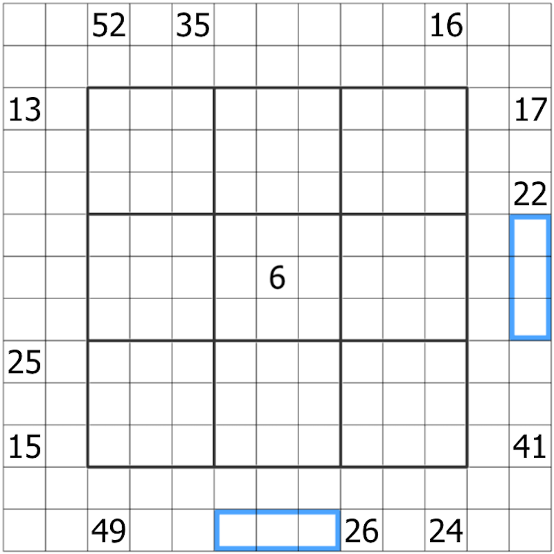 Die Felder direkt außerhalb des Gitters sind mit "Numbered Rooms"-Hinweisen zu versehen. Ein Hinweis X bedeutet, dass die Ziffer X N Schritte vom Hinweis entfernt ist, wobei N die erste im Gitter sichtbare Ziffer ist.