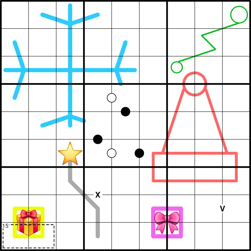 - Die rote Weihnachtsmütze ist eine Paritätslinie. Entlang dieser Linie wechseln sich gerade und ungerade Ziffern ab.