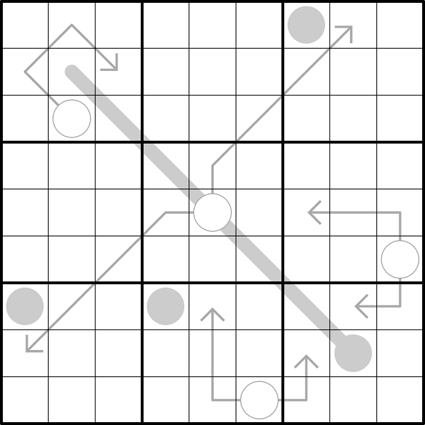Arrows: the sum of the digits along an arrow is equal to the digit in the connected circle, and these digits can repeat if allowed by other rules.