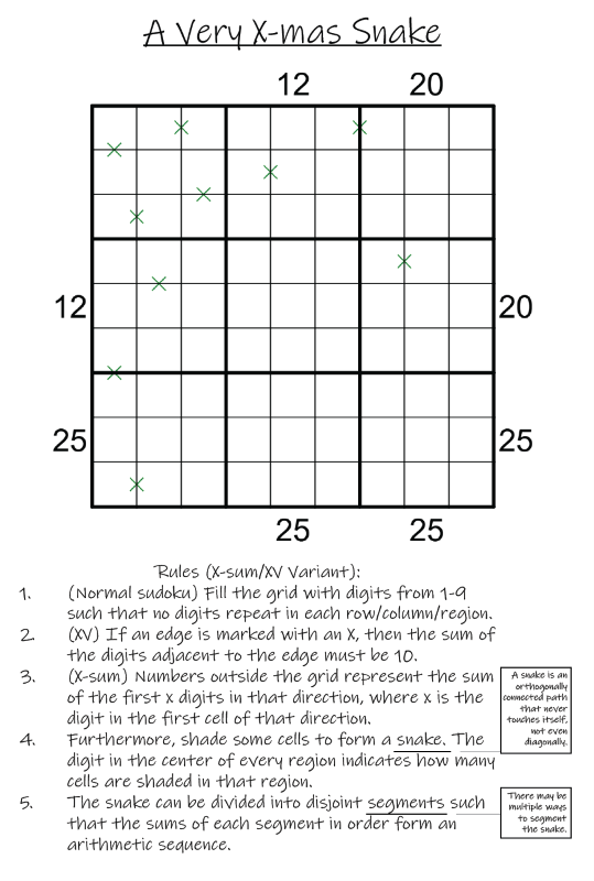 This is one of 12 disjoint puzzles I made this year with varying styles/difficulties themed around snakes and 2025.