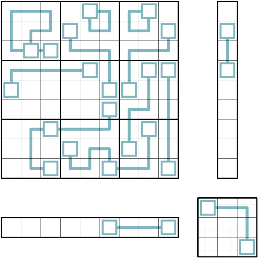 - The sum of the digits on a line between two squares is equal to the product of the two digits in those squares.