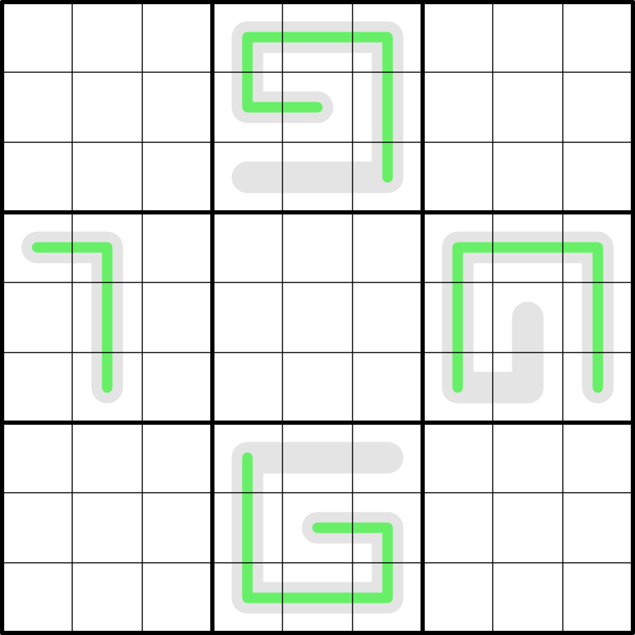 A digit N on a gray line indicates that N cannot appear in any cell at exactly the distance N (measured in orthogonal moves) from the origin cell.