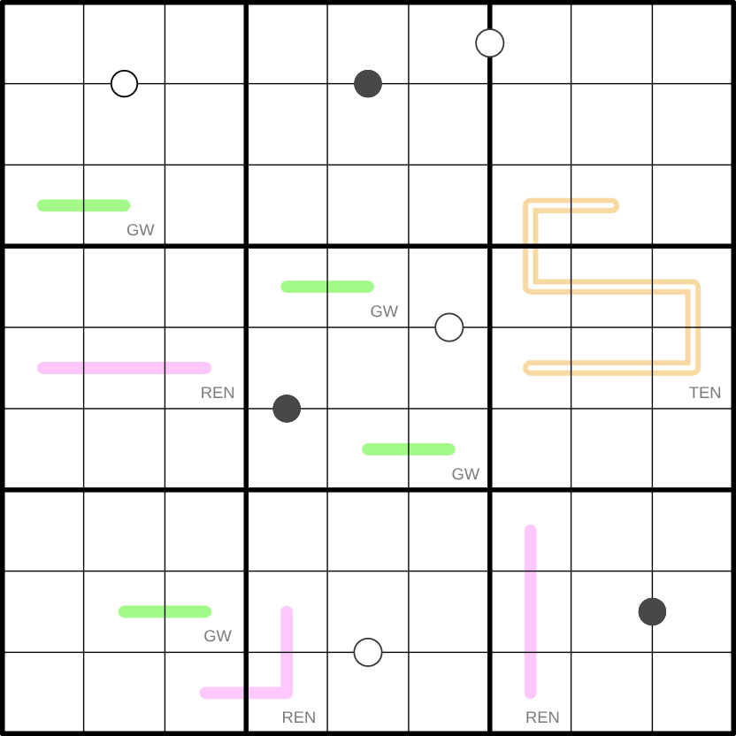 Regional Constraints: For each clue type, there may be no repeated digits on that type. E.g. the 9 cells on renbans contain 9 different digits.