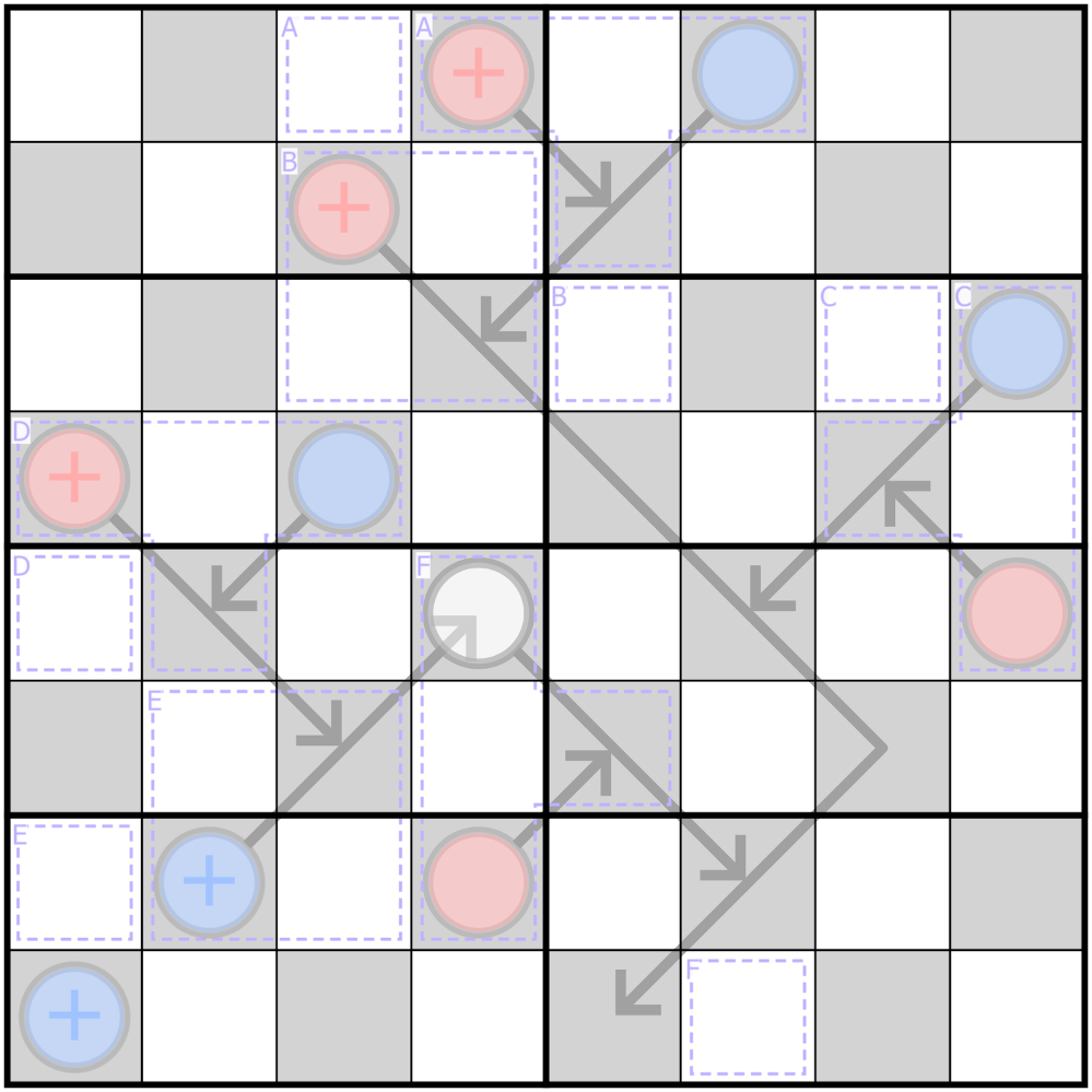 Willkommen zu den letzten Zügen einer ausgeglichenen Partie Checkers. Sie werden die Grundregeln dieses berühmten Brettspiels kennen müssen um dieses Sudoku-Rätsel lösen zu können (sollte das nicht der Fall sein, dann können Sie die Regeln beispielsweise hier nachlesen).