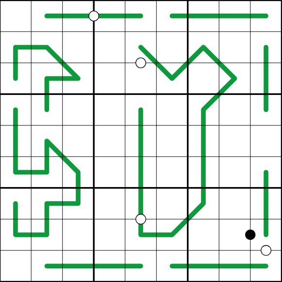 Kropki dots: Digits separated by a white dot are consecutive. Digits separated by a black dot are in a 1:2 ratio