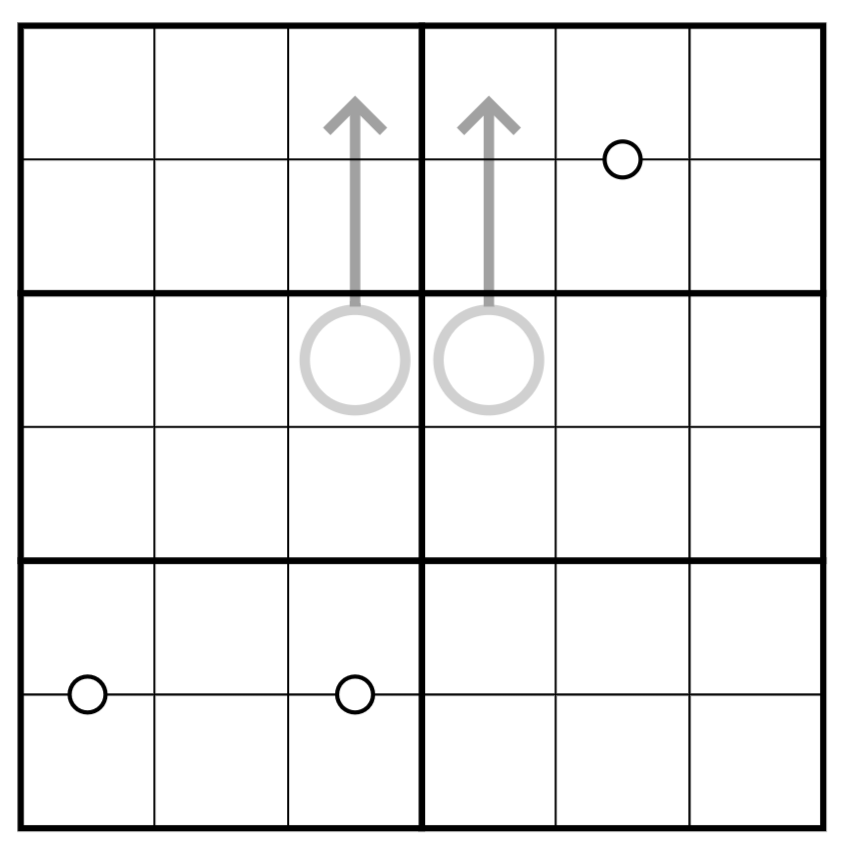 Kropki Dots: Digits in cells joined by a white dot are consecutive.