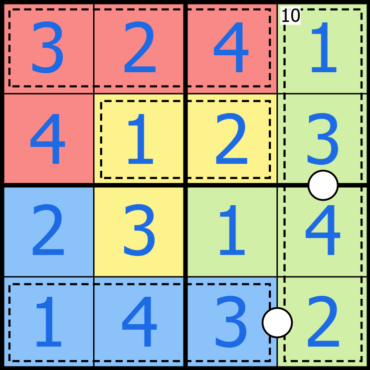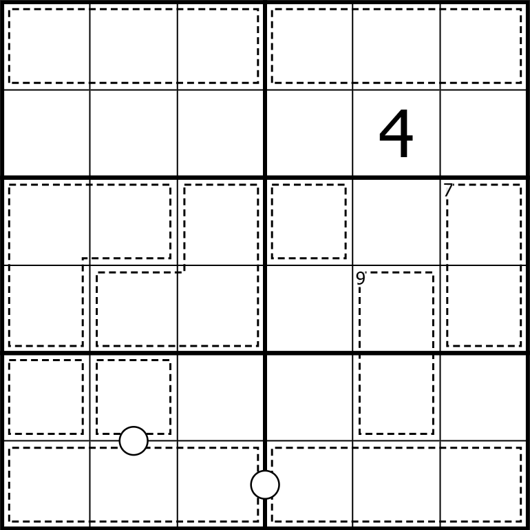 - Partial Kropki: White dots lie between consecutive digits. Not all dots are necessarily given.