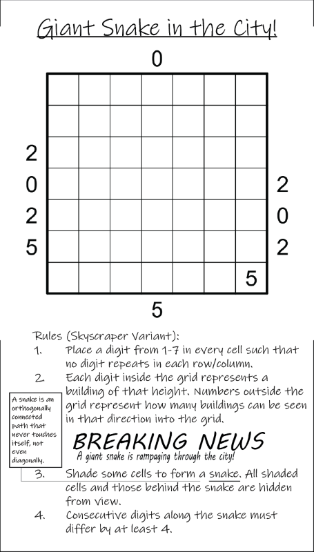 This is one of 12 disjoint puzzles I made this year with varying styles/difficulties themed around snakes and 2025.