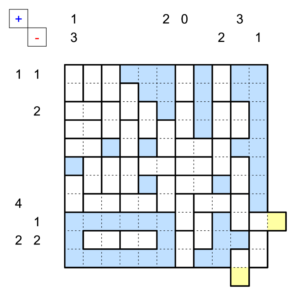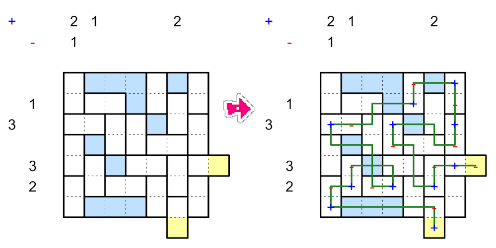 - Hinweise außerhalb des Gitters zeigen die Anzahl der + und - Pole in der jeweiligen Zeile oder Spalte an (einschließlich Start- und Endpunkt in ihrer jeweiligen Zeile und Spalte).