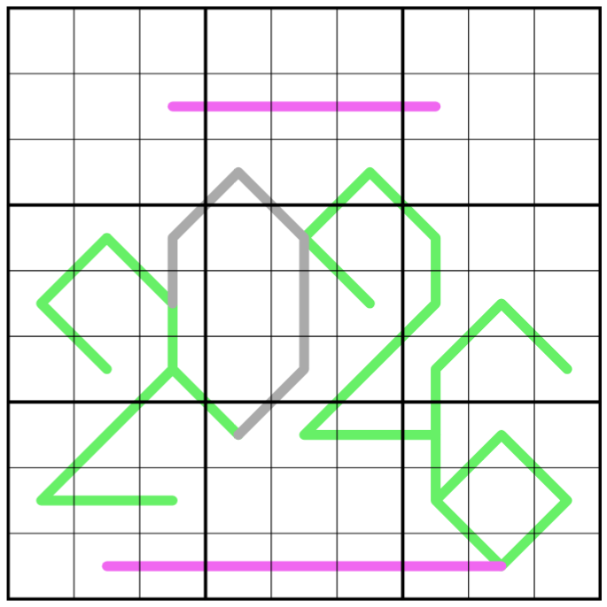 Renban: Auf pinken Linien befinden sich verschiedene Ziffern einer Menge von konsekutiven Zahlen in beliebiger Reihenfolge.