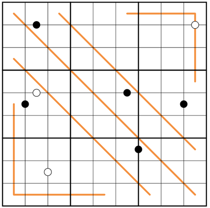 Kropki Dots: Digits separated by a white dot have a difference of one, digits separated by a black dot have a ratio of 2:1.
