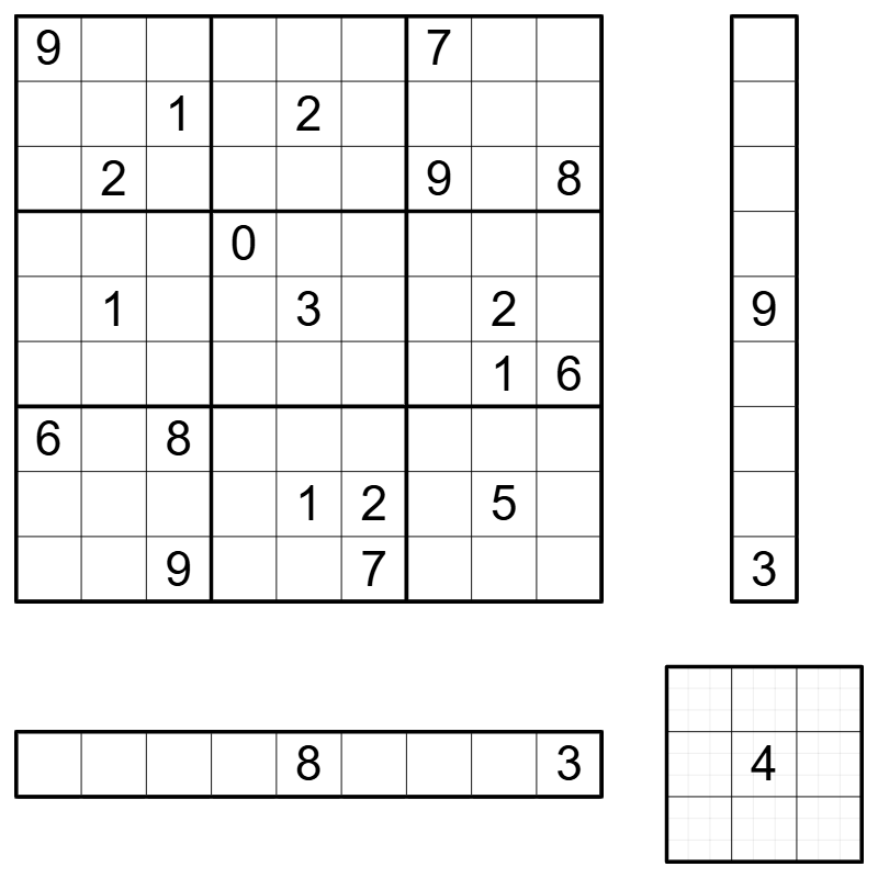 - Fill each cell of the main grid such that every row, column and box contains a 0 and eight different digits from 1-9.