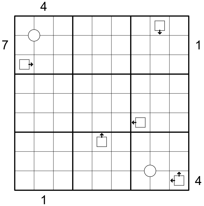 Policemen: These are arrows inside the grid. They occupy the cell with the arrow(s), and additionally see D further cells in the direction of each arrow, where D is the digit in the policeman's cell, regardless of the digit the seen cell contains.