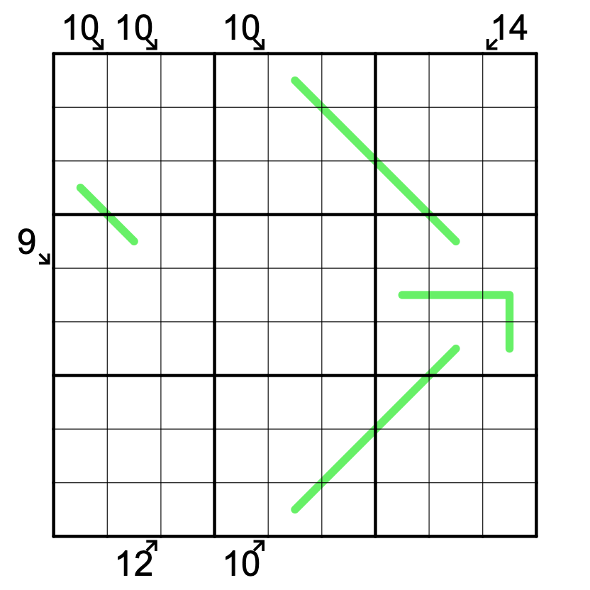 Little Sandwiches. A clue outside the grid gives the sum of the digits strictly between the 1 and the 9 along the indicated diagonal. Each indicated diagonal contains exactly one 1 and one 9.