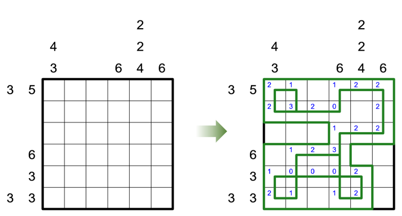 - Summation: A cell's value equals the product of its slitherlink number and its U-Bahn number. Clues outside the grid represent the sum of values in each contiguous sequence of cells visited by the U-Bahn network, in the order of appearance from left to right or top to bottom. Consecutive sequences must be separated by at least one cell not visited by the U-Bahn network.