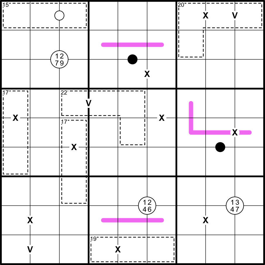 A "V" between cells indicates that the two cells must equal 5; not all "V"'s are given