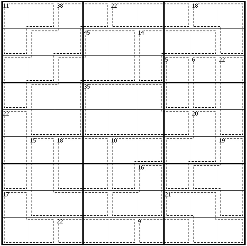 - Killer: Zahlen in einem Käfig ergeben summiert den kleinen Hinweis links oben am Käfig. Zahlen wiederholen sich nicht innerhalb eines Käfigs.