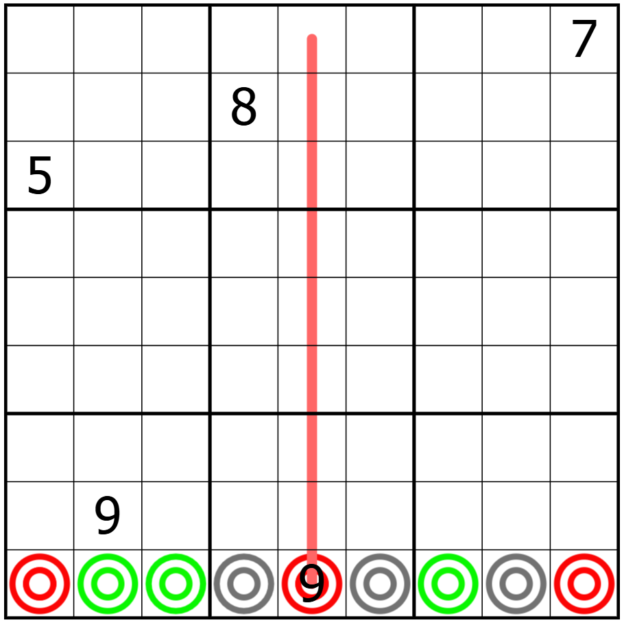 Row 9 is filled with targets of various colors that serve as the targets for the solver to hit with their hammer. The number placed on each target represents the "strength" of the swing, and indicates the length of the vertical line that extends from the target, including the target cell (see column 5 for an example).
