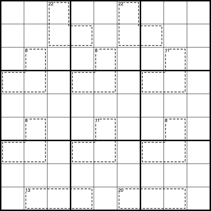 Normal sudoku rules apply. Digits in a cage cannot repeat and must sum to the given total.