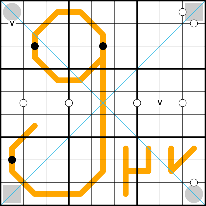 Diagonals: Digits may not repeat along the marked diagonals