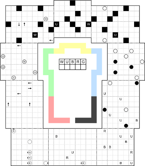 Azorius (white/blue): The masyu loop cannot pass through black cells. Every light in the 7x9 area must act as either a white or black circle for the masyu loop (it is up to the solver to determine which type of circle each light is). Given masyu circles may or may not be in the same cell as a light.