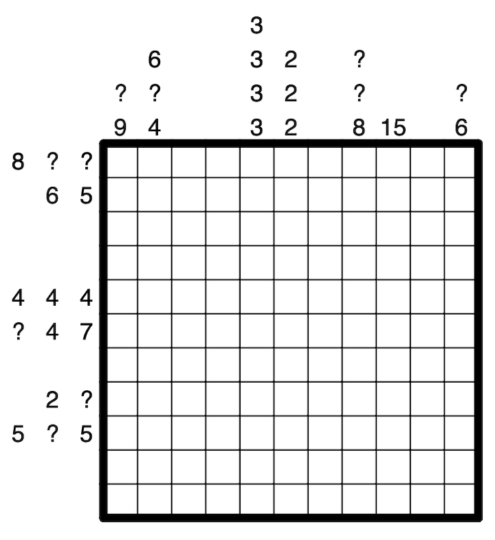 Clues outside the grid give the sums of heights of connected candles in order, where empty cells separate groups. A question mark can be any nonzero value.