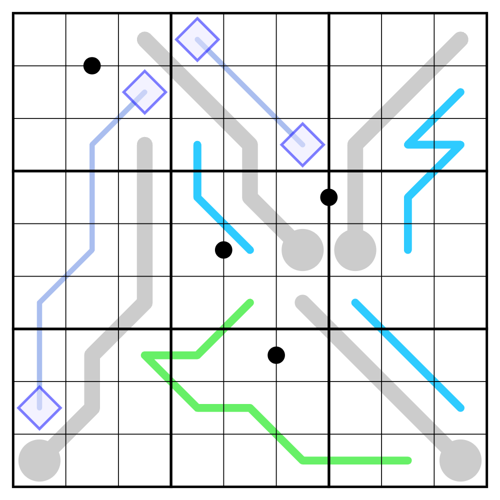 Lockout lines (light blue diamonds): Digits along a lockout line must not be between the digits in the diamonds at the ends of the line. These end digits must have a difference of at least 4.
