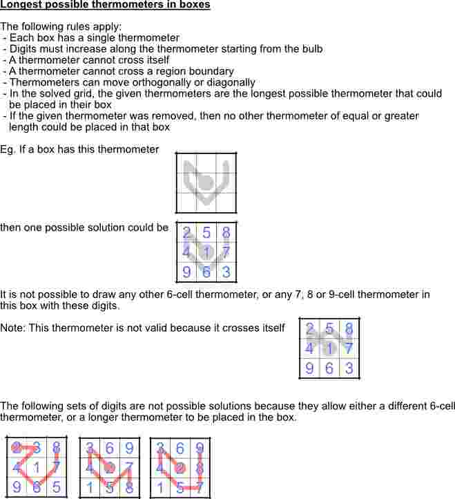 For example, in the solved grid, if the thermometer in the top left box was removed then it would not be possible to draw a different 6-cell thermometer, or any 7, 8 or 9-cell thermometer in the top left box.