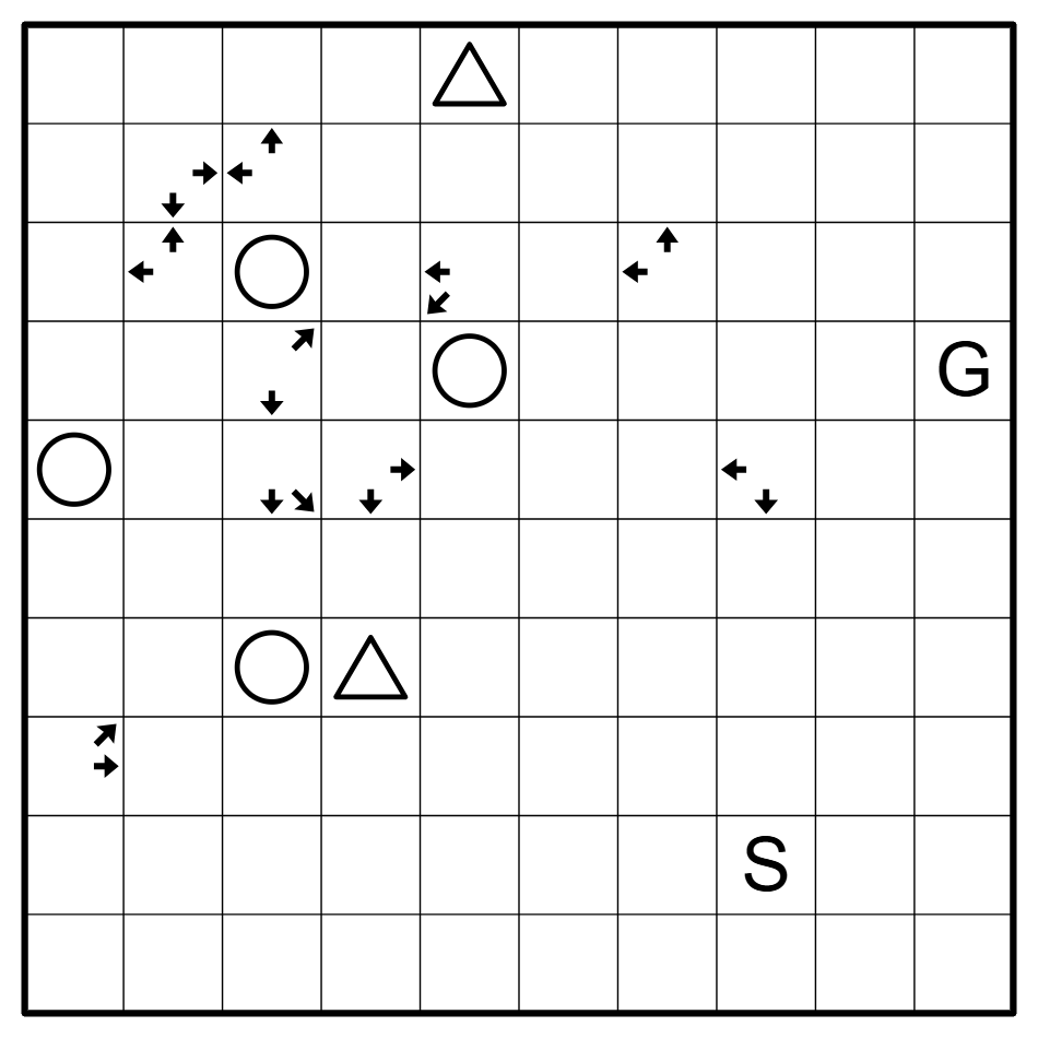 - There is exactly one orthogonal path of unshaded cells from S to G that passes through every circle, and doesn't backtrack. Triangles are unshaded but not on the path.
