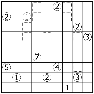 Divide the grid into a number of islands -- orthogonally connected groups of cells. Every island contains a single circled cell; the digit in the circle indicates the number of cells making up the island.