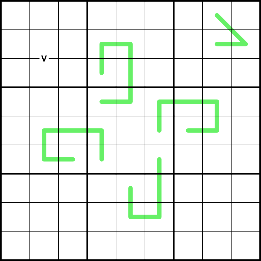• German Whispers: Adjacent digits along a green line must differ by at least 5.