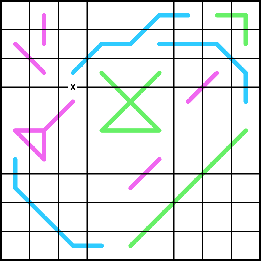 Region Sum Lines: Die Regionen-Grenzen teilen blaue Linien in Segmente mit der jeweils gleichen Summe. (Verschiedene Linien können verschiedene Summenwerte haben.)