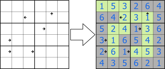 The image below shows a sample 6x6 puzzle and solution with the same rule set.