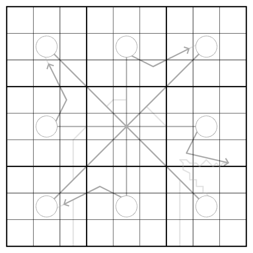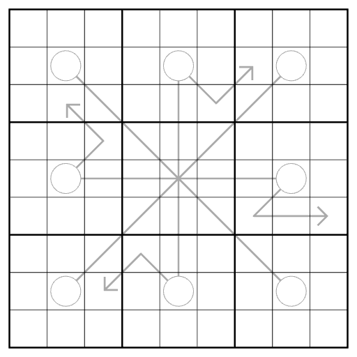 Double arrows: Digits on a line sum to the sum of the digits on the end of the line. All double arrows lines are straight.