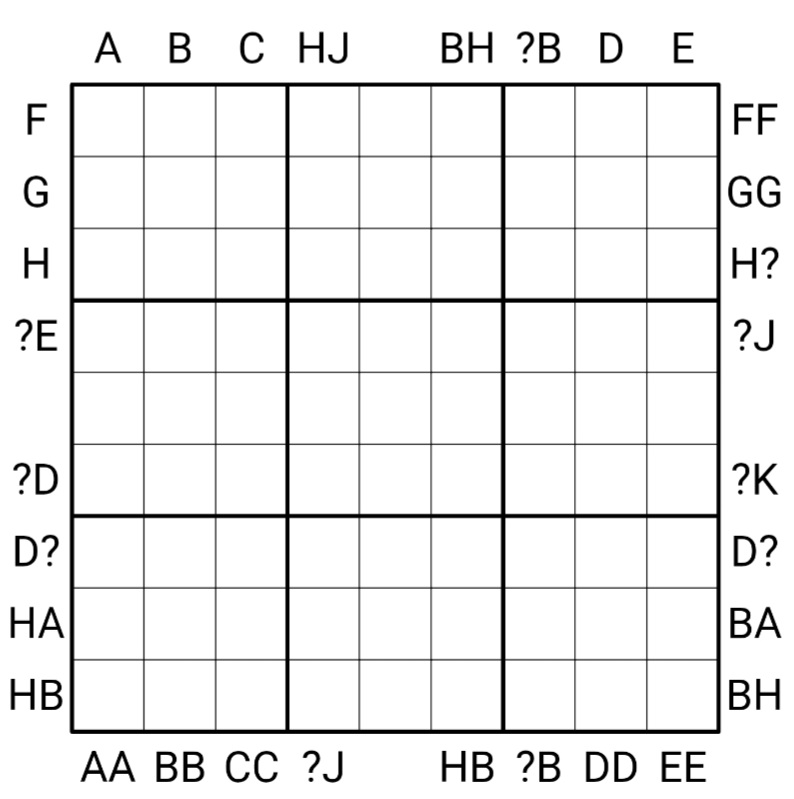 - Cipher : Clues are encrypted. Each distinct letter represents some unique digit from 0-9. A "?" is a stand in for any digit 0-9, but for a single digit or double digit number, the first digit may not be 0.