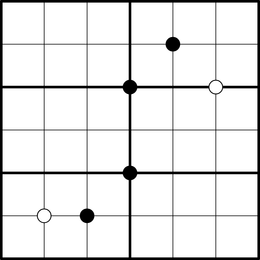• A Kropki dot placed at a vertex (the corner where four cells meet) applies to both diagonal pairs sharing that vertex.