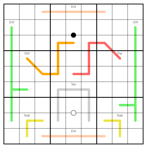 Ent: Any set of three adjacent cells along an Ent line must contain a low digit (123), a middle digit (456), and a high digit (789).