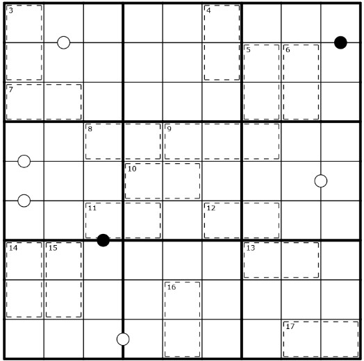 Die Zahlen in einem Käfig addieren sich zur genannten Summe (je ein Käfig mit den Summen von 3 bis 17)