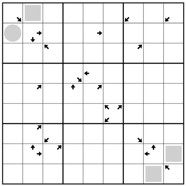 • Digits in cells containing one or more arrows equal the total number of cells in the indicated direction(s) combined that are the same parity as the digit in the arrow cell (e.g. if a cell that contained two arrows--one pointing up and one pointing right--was found to be a 3, then of the cells that are above or to the right of that arrow cell, a combined total of exactly 3 of them must be odd).
