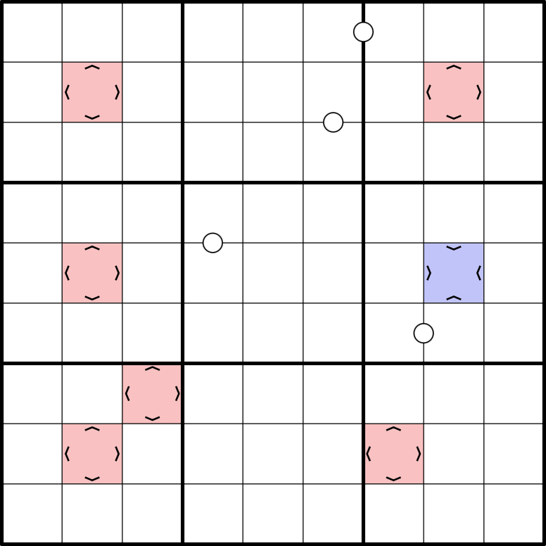 Fortress: Red cells with outward pointing arrows are larger than all of their orthogonal neighbors. Blue cells with inward pointing arrows are smaller than all of their orthogonal neighbors.
