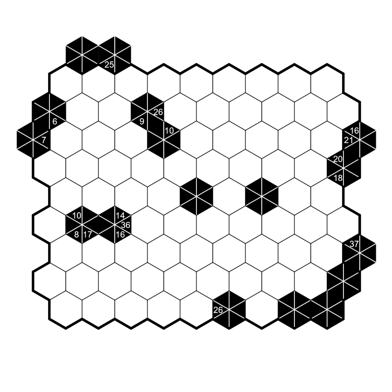- Die Zahlen auf den schwarzen Sechsecken geben die Summe der Ziffern an, die das jeweilige Sechseck in der angegebenen Richtung sieht, bis zum nächsten schwarzen Sechseck (oder bis zum Rand des Spielfelds, je nachdem, was zuerst kommt).
