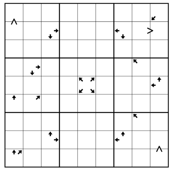 - Digits in cells containing one or more arrows equal the total number of cells in the indicated direction(s) combined that are larger than the digit in the arrow cell (e.g. if a cell that contains two arrows--one pointing up and one pointing right--was found to be a 4, then of all the cells that are above or to the right of that arrow cell, a combined total of exactly 4 of them contain digits that are larger than 4).