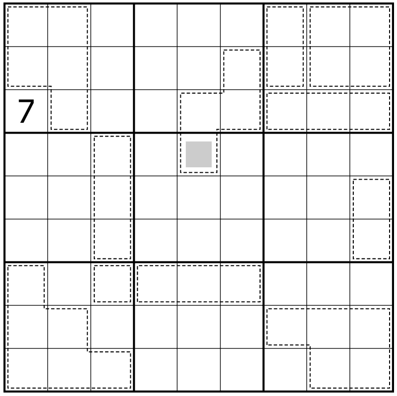 Es gelten die normalen Sudoku-Regeln. Jeder Käfig summiert sich auf eine von drei unterschiedlichen Gesamtsummen, die vom Löser bestimmt werden müssen. Käfige gleicher Größe müssen unterschiedliche Summen haben. Ziffern im Springerzug-Abstand (wie im Schach) dürfen nicht dieselbe Ziffer enthalten. Das graue Feld enthält eine gerade Ziffer.