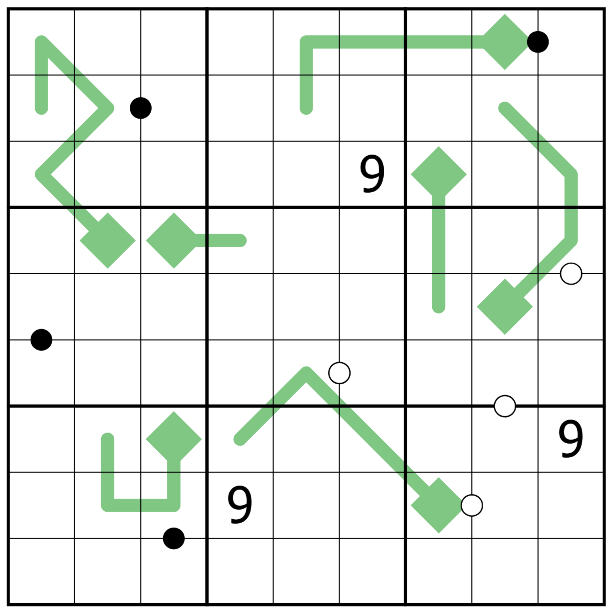 - Starting from the diamond, the sequence must visit all digits on the line exactly once, and return to the diamond.