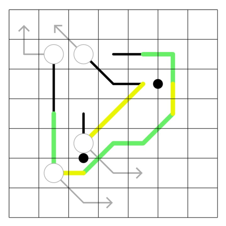A black Extension Cord line connects all other lines and arrows it touches so that, segments of the same line type are joined together by adjacent ends along its stretch, and double arrows are created when it connects two arrow circles. The length and path of an Extension Cord does not need to be assumed. It continues underneath other lines and does not branch unless specified. It may begin and end outside the grid to clarify its path or length.