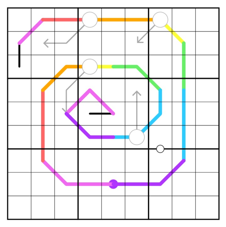 A black Extension Cord line connects all other lines and arrows it touches so that, segments of the same line type are joined together by adjacent ends along its stretch, and double arrows are created when it connects two arrow circles. The length and path of an Extension Cord does not need to be assumed. It continues underneath other lines and does not branch unless specified. It may begin and end outside the grid to clarify its path or length.