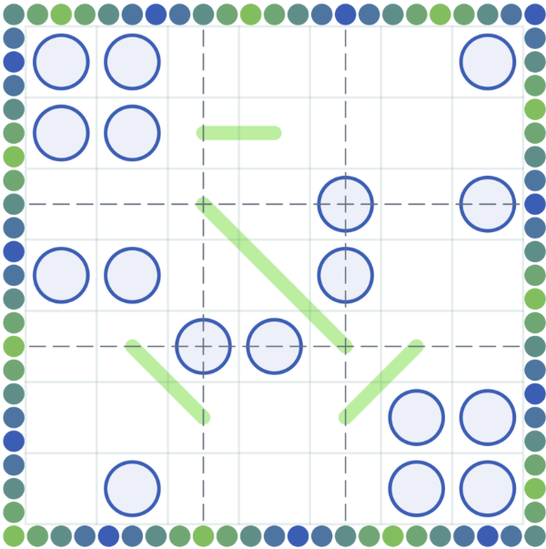 - Place the digits 1 through 9 once each in every 3x3 region, without repeats in any row or column. Cells on region borders (dashed lines) are shared between multiple boxes.