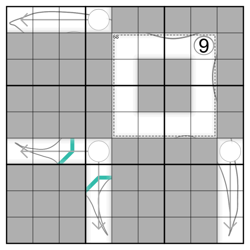 • Every 3 consecutive cells along a 3-modular line must contain a complete set of residuals modulo 3. i.e: one from (3,6,9), one from (1,4,7) and one from (2,5,8).