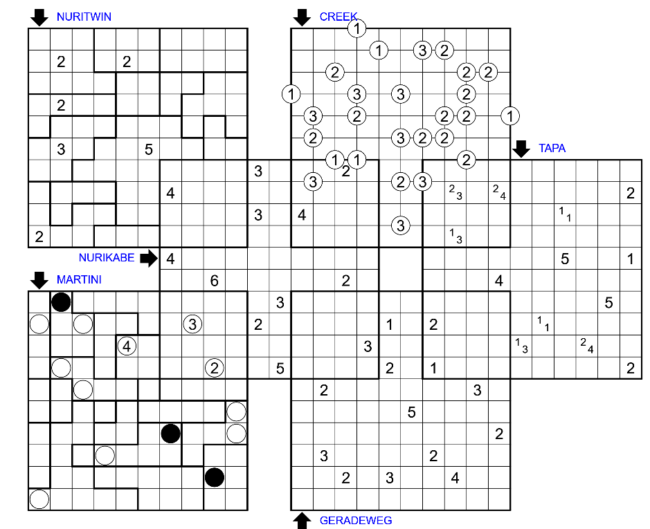 Lösungscode: For the shading puzzles, the total number of shaded cells on the bottom row. For the Geradeweg enter the number of turns in the bottom row. The order to enter the numbers is Nuritwin, Creek, Nurikabe, Tapa, Martini, and then Geradeweg. (6 numbers)