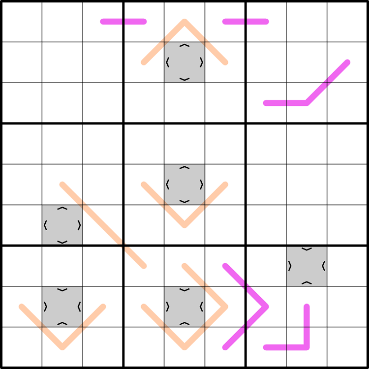 • Entropische Linien: Jede Dreiergruppe von Ziffern auf den pfirsichfarbenen Linien muss eine kleine Ziffer (1, 2, 3), eine mittlere Ziffer (4, 5, 6) und eine große Ziffer (7, 8, 9) enthalten.